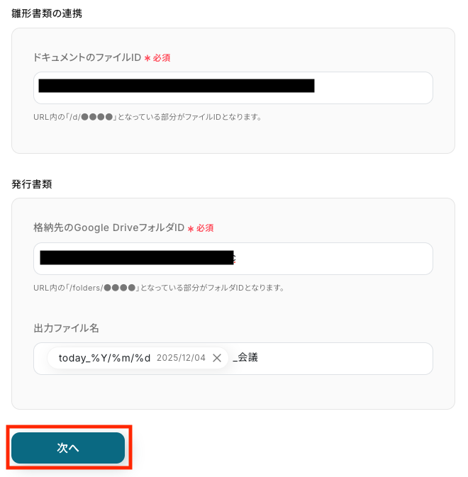 このステップでは、ステップ3で取得した文字起こしデータをもとに、Googleドキュメントを使ってPDFファイルを作成する設定を行います。