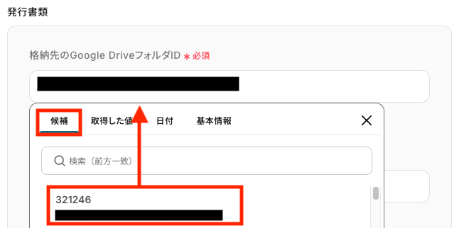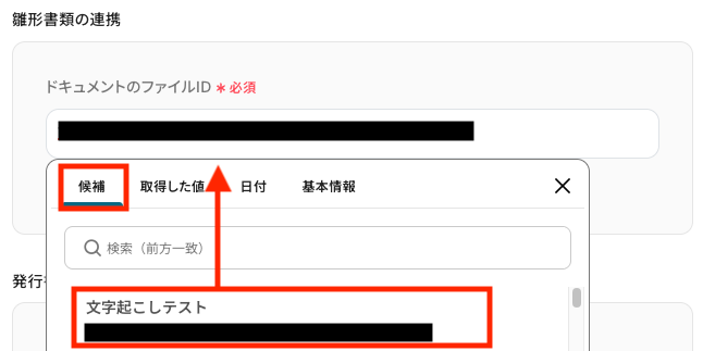 「ドキュメントのファイルID」の入力欄をクリックし、表示された候補から事前に作成した雛形書類を選択します。