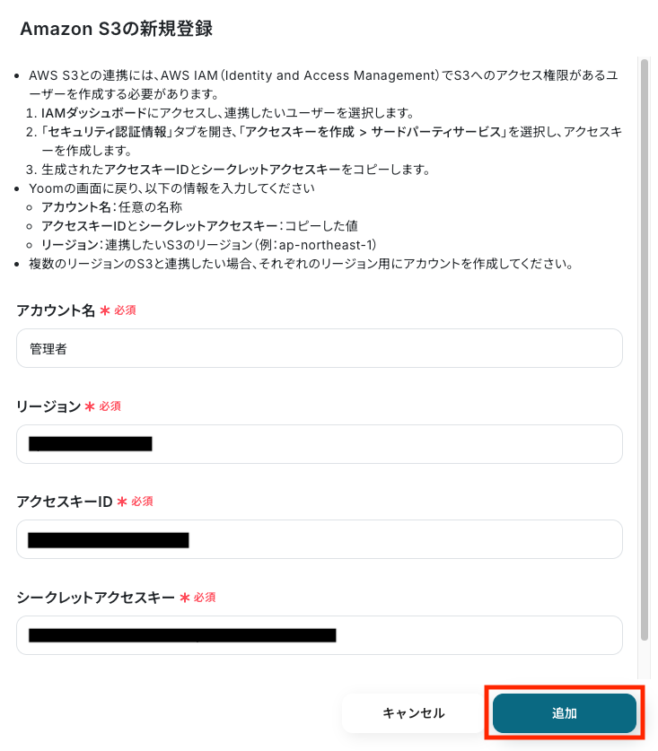 新規登録画面が開いたら、記載されている説明を参考に、以下の項目の値をAmazon S3アカウントのページから取得してください。