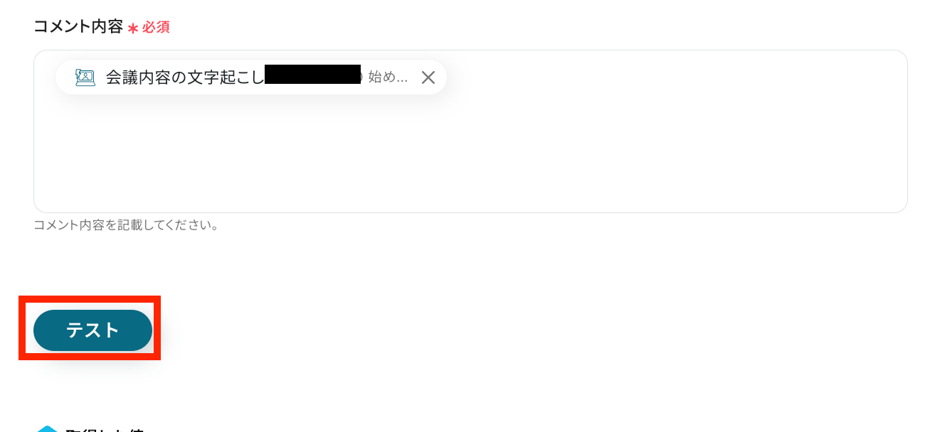 - 最後に、オペレーションでAsanaの「タスクにコメントを追加」を設定し、文字起こしの全文などをコメントとして登録します
