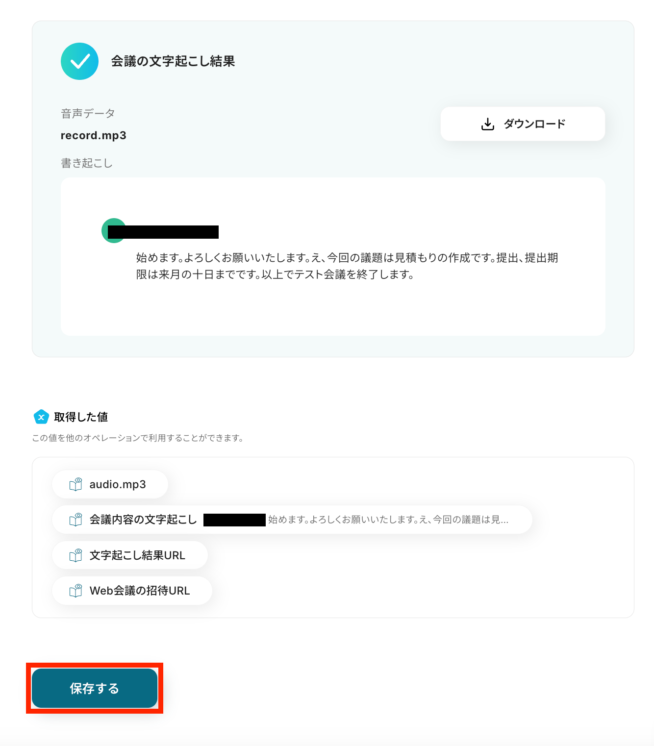 文字起こし結果と取得した値が確認できたら、「保存する」ボタンを押しておきましょう!