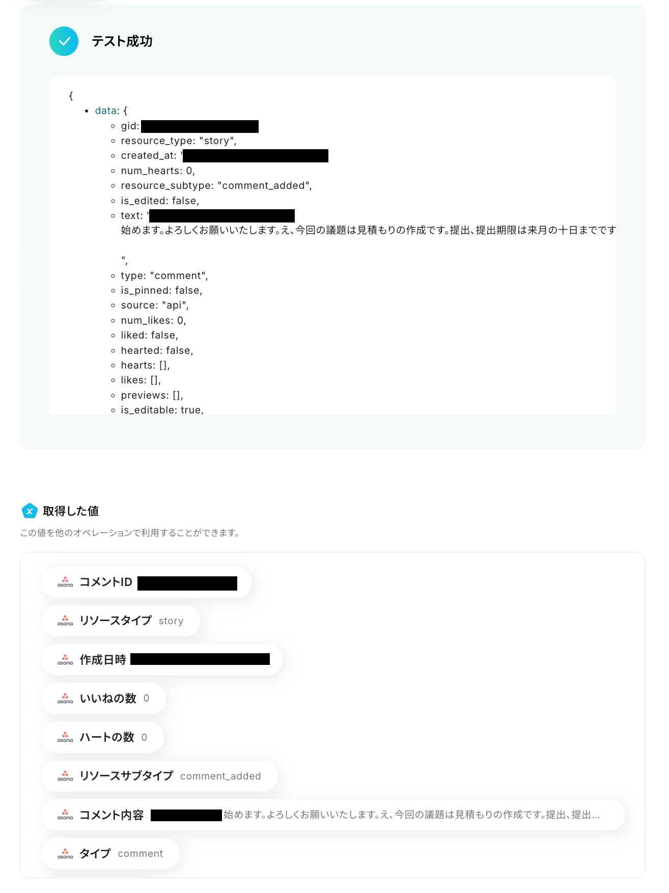 テスト成功という表示がされたら、Asanaのタスクにコメントが追加されています!