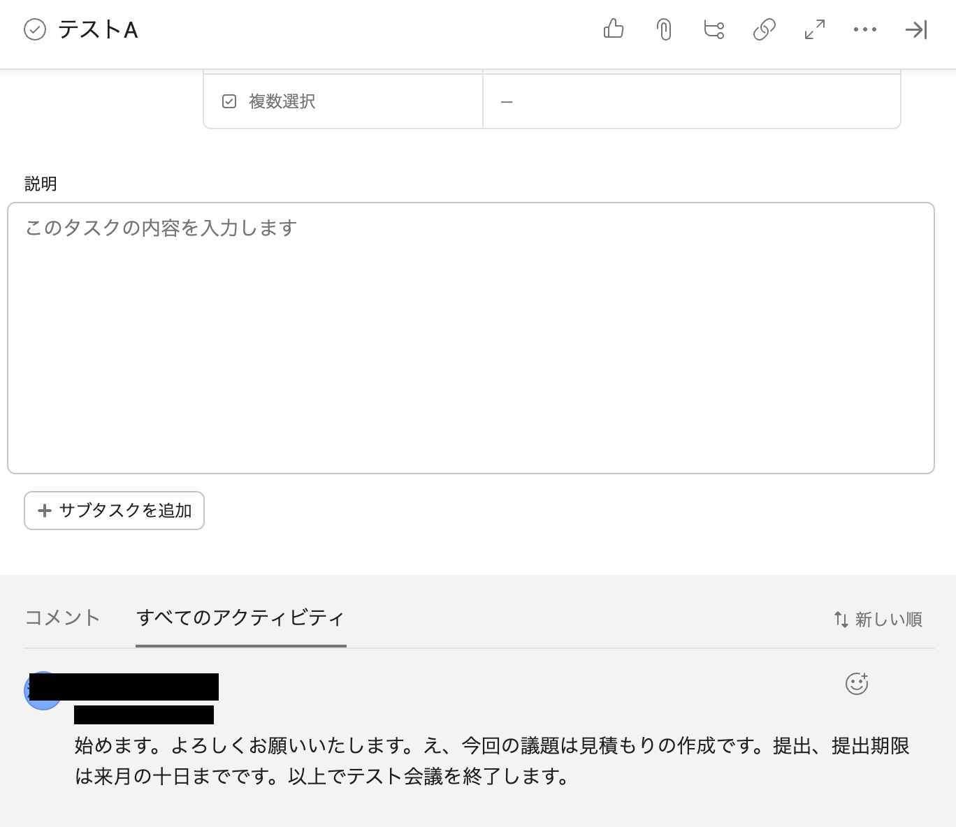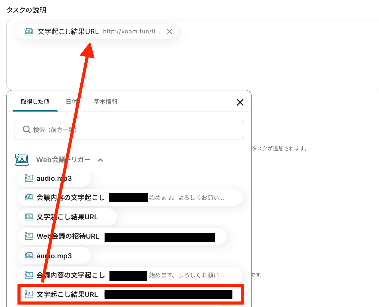 タスクの説明は、Web会議で取得した値を利用して設定してみましょう!