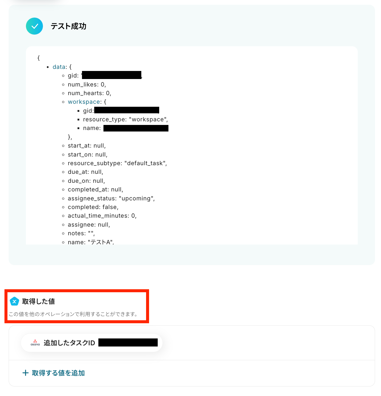 取得した値を利用してAsanaにタスクを追加する設定を行います。