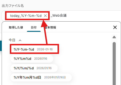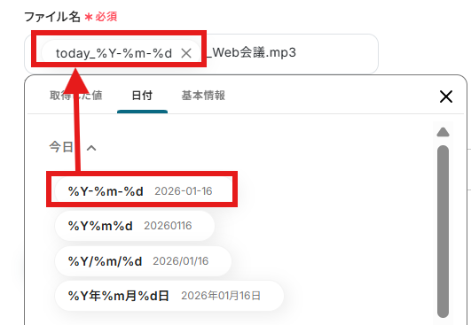 ファイル名は日付項目を使うなどし、わかりやすく入力してください。