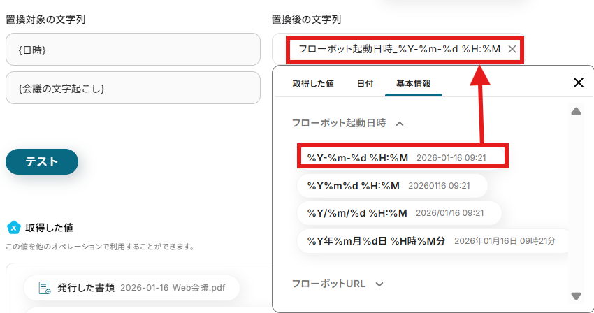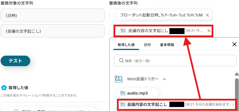 Googleドキュメント上に情報を入れ込んでいくため、置換対象の文字列を入力していきます。 {日時}は「基本情報」から「フローボットの起動日時」を、{会議の文字起こし}には「取得した値」から「会議内容の文字起こし」をそれぞれ入力します。