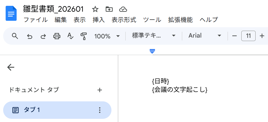 今回は雛型書類をコピーして書類を作成していくので、Google ドキュメントに以下のような雛型書類を作成しておきます。 なお、コンテンツを{}で括っておくと置換の際便利なので、お試しください。 下記のページも参考にしてください。