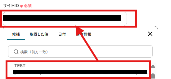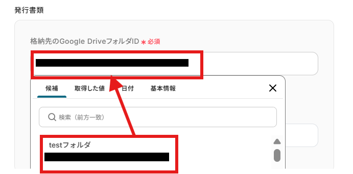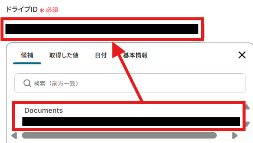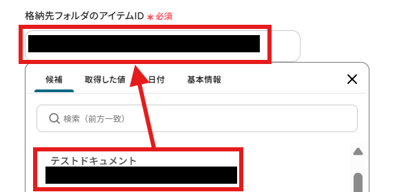 候補から書類のアップロードを行いたいサイトID・ドライブID・格納先フォルダのアイテムIDを入力します。