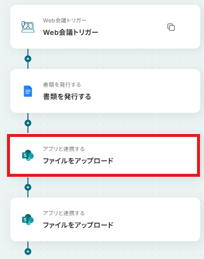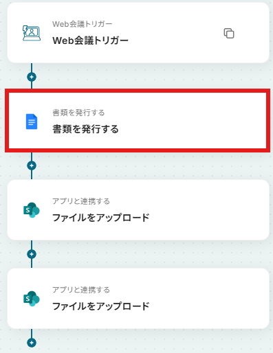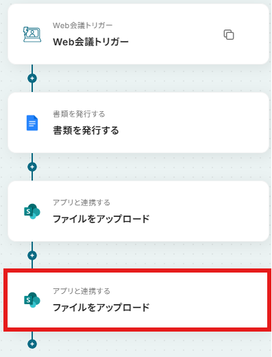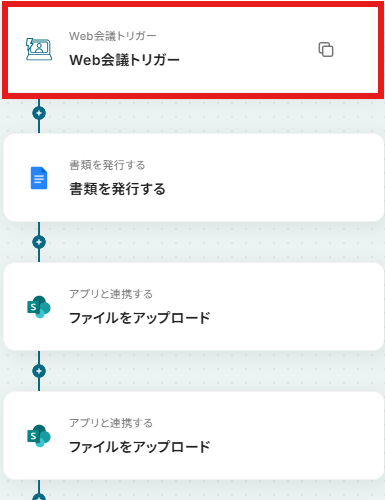 はじめに、Microsoft SharePointとGoogleドキュメントをYoomと連携します 次に、トリガーでWeb会議トリガーを選択し、「Web会議が開始されたら」というアクションを設定します 次に、オペレーションでGoogleドキュメントの「書類を発行する」アクションを設定し、文字起こし結果を基にドキュメントを作成します 続けて、オペレーションでMicrosoft SharePointの「ファイルをアップロードする」アクションを設定し、作成されたPDFをアップロードします 最後に、もう一度Microsoft SharePointの「ファイルをアップロードする」アクションを設定し、Web会議の音声ファイルをアップロードします ※「トリガー」:フロー起動のきっかけとなるアクション、「オペレーション」:トリガー起動後、フロー内で処理を行うアクション■このワークフローのカスタムポイント