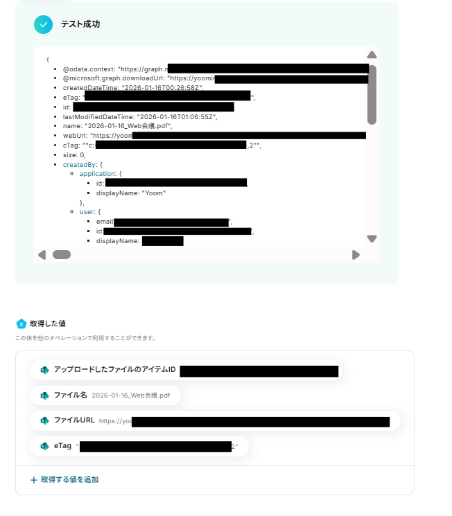※取得した値 とは? トリガーやオペレーション設定時に、「テスト」を実行して取得した値のことを指します。 後続のオペレーション設定時の値として利用でき、フローボットを起動する度に変動した値となります。