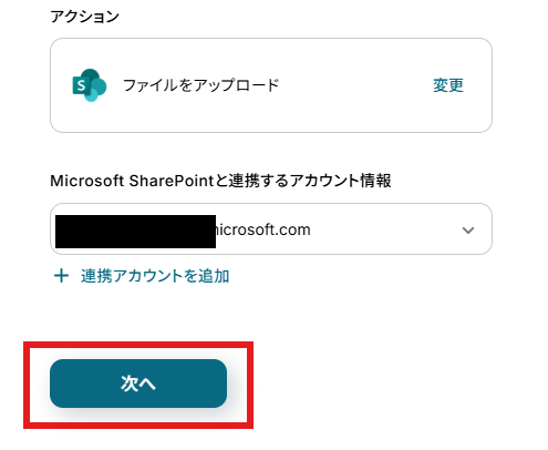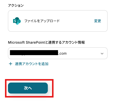 アクションはデフォルト設定のまま、アカウント情報は連携したいアカウントが選択されているか確認してください。確認が終わったら「次へ」で進みましょう。