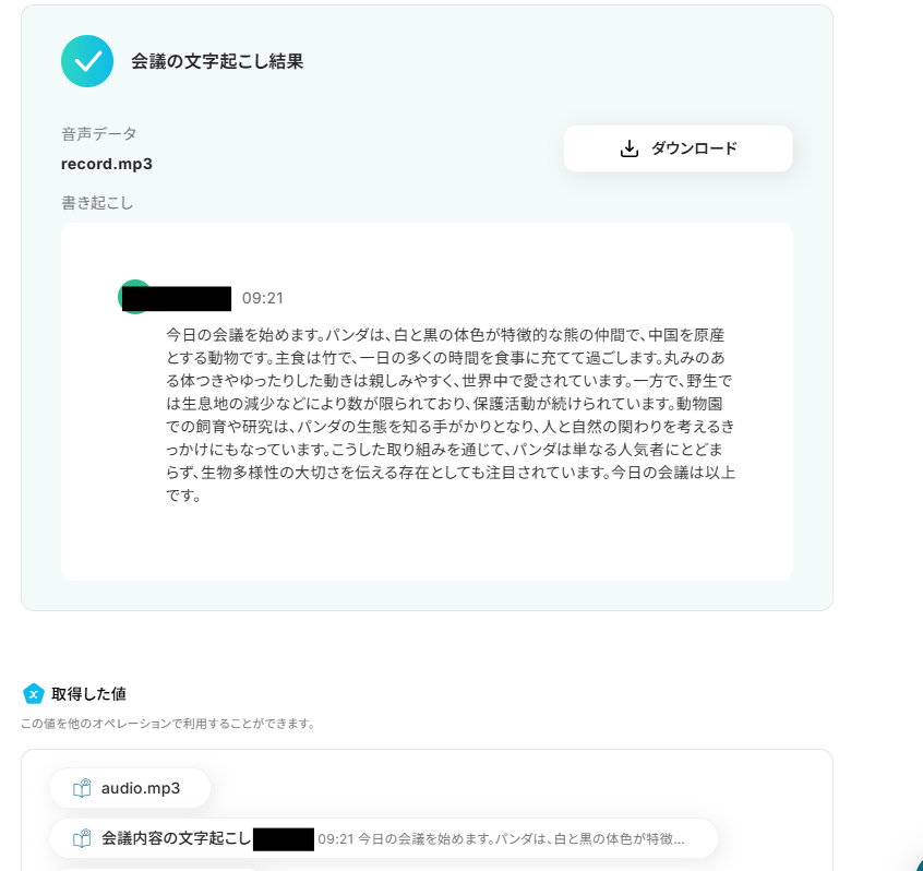 会議を終えたらミーティングから退出しましょう。 Yoom設定画面に戻り、会議の文字起こし結果と取得した値が入っていればOKです。