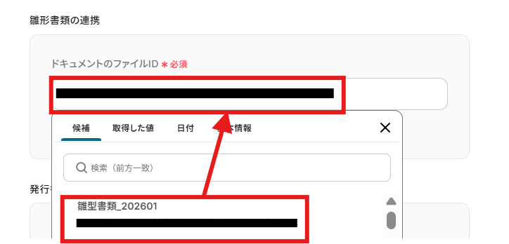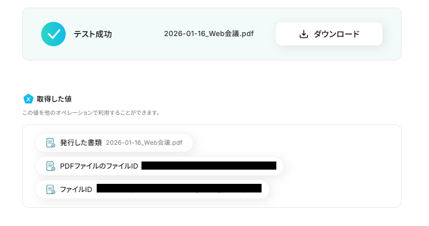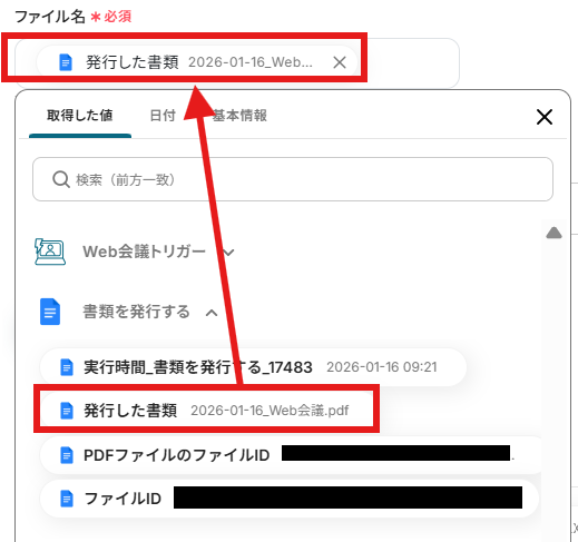 ファイル名は書類を発行した際のものを、取得した値より入力しました。