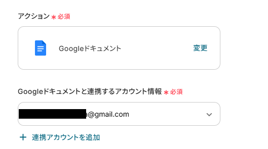 アクションはデフォルト設定のまま、アカウント情報は連携したいアカウントが選択されているか確認してください。