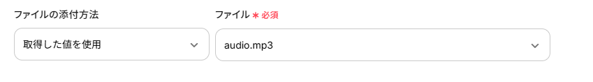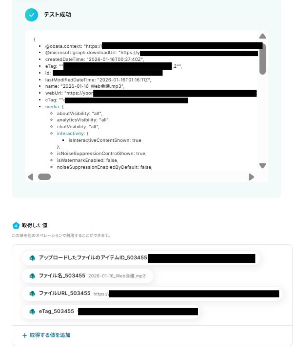 「ファイルの添付方法 :取得した値を使用」 「ファイル :audio.mp3」 になっていることを確認したら、テストボタンをクリックしてください。