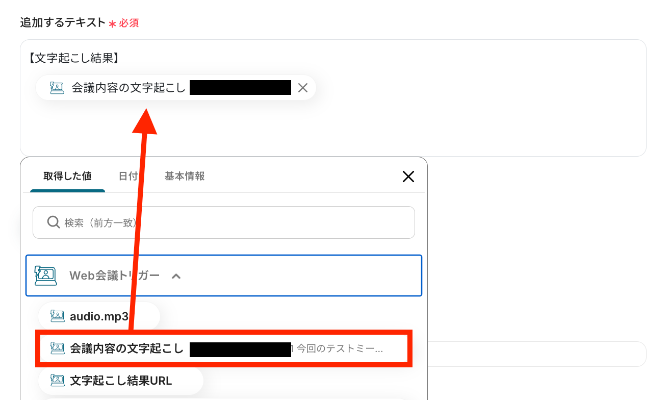 追加するテキストは、Web会議トリガーをクリックし、取得した値から「会議内容の文字起こし」を選択しましょう。
