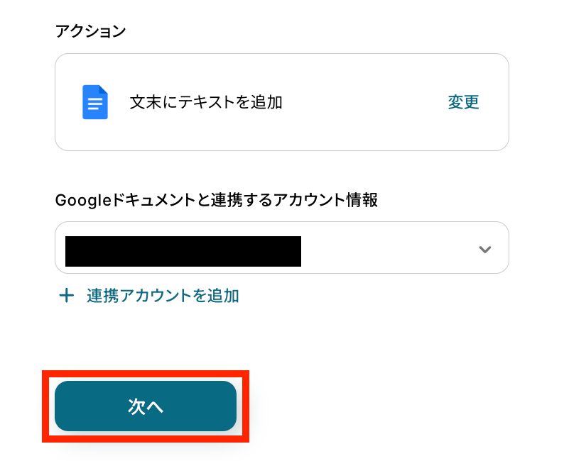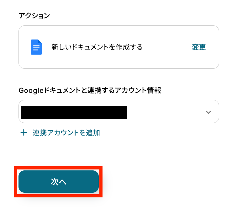 アクションはテンプレートのままで、Googleドキュメントと連携するアカウント情報を確認したら次の設定へ進みます。