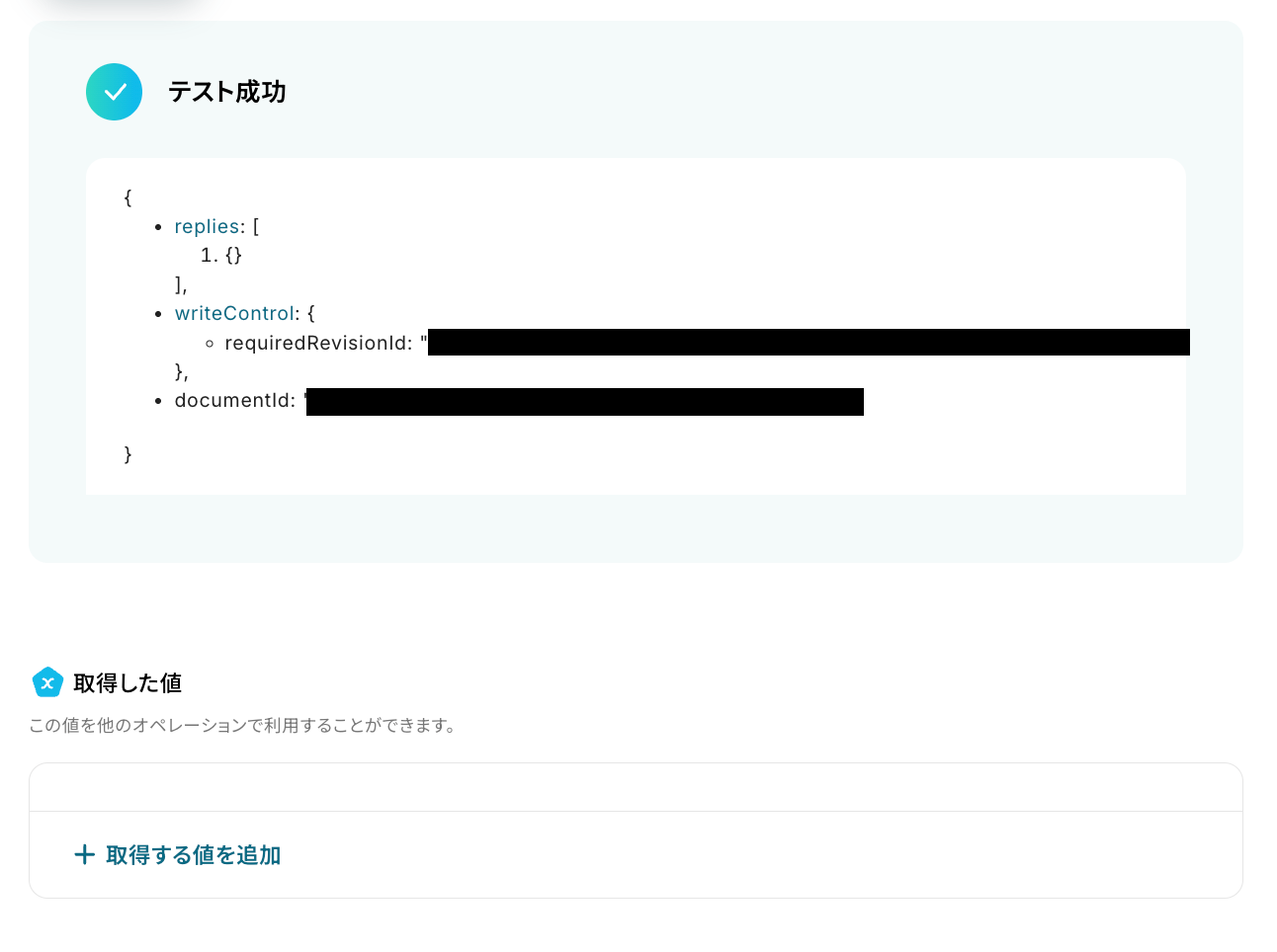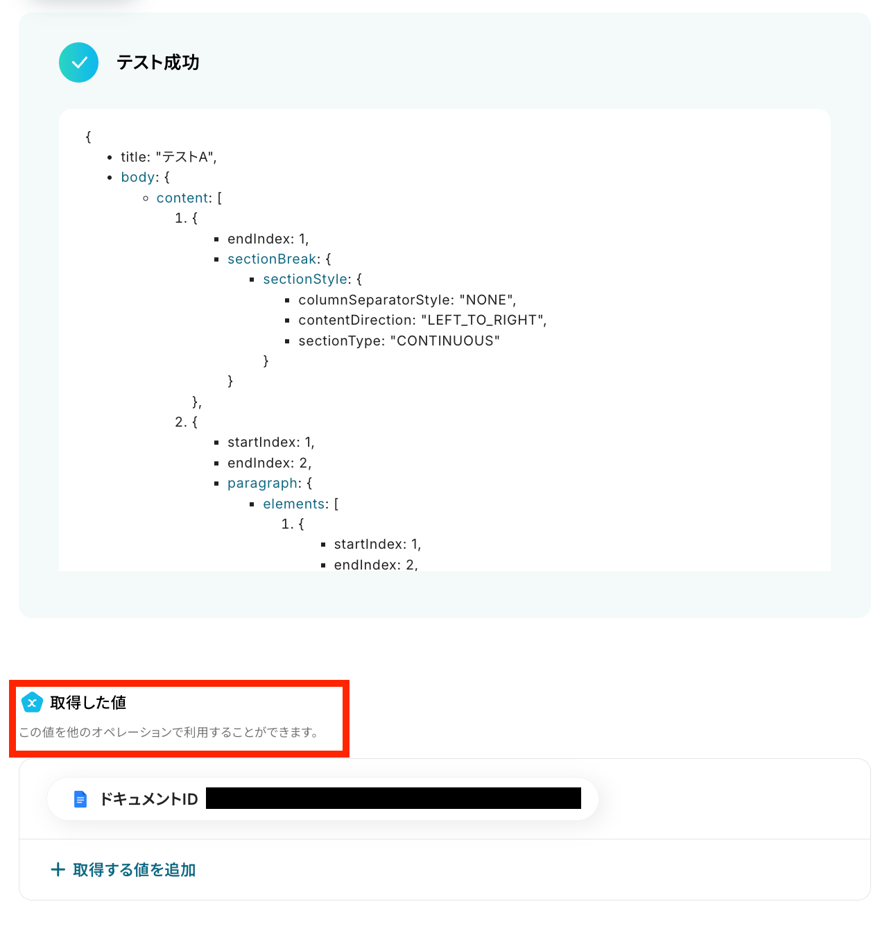 最後に、今まで取得した値を活用してGoogleドキュメントに文章を追加する設定を行います。