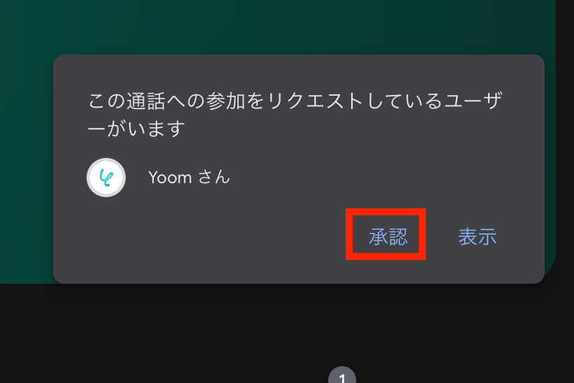 Yoomボットが会議に参加する通知が会議画面に届きますので、参加を承認してYoomボットを会議に参加させましょう。