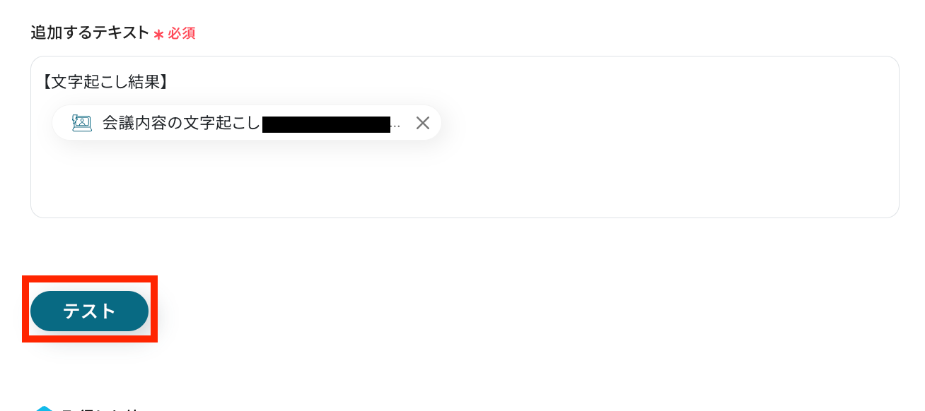 - Googleドキュメントに追加するテキストには、文字起こし結果だけでなく、任意の固定テキストや、前段のフローで取得した情報を組み合わせて設定できます