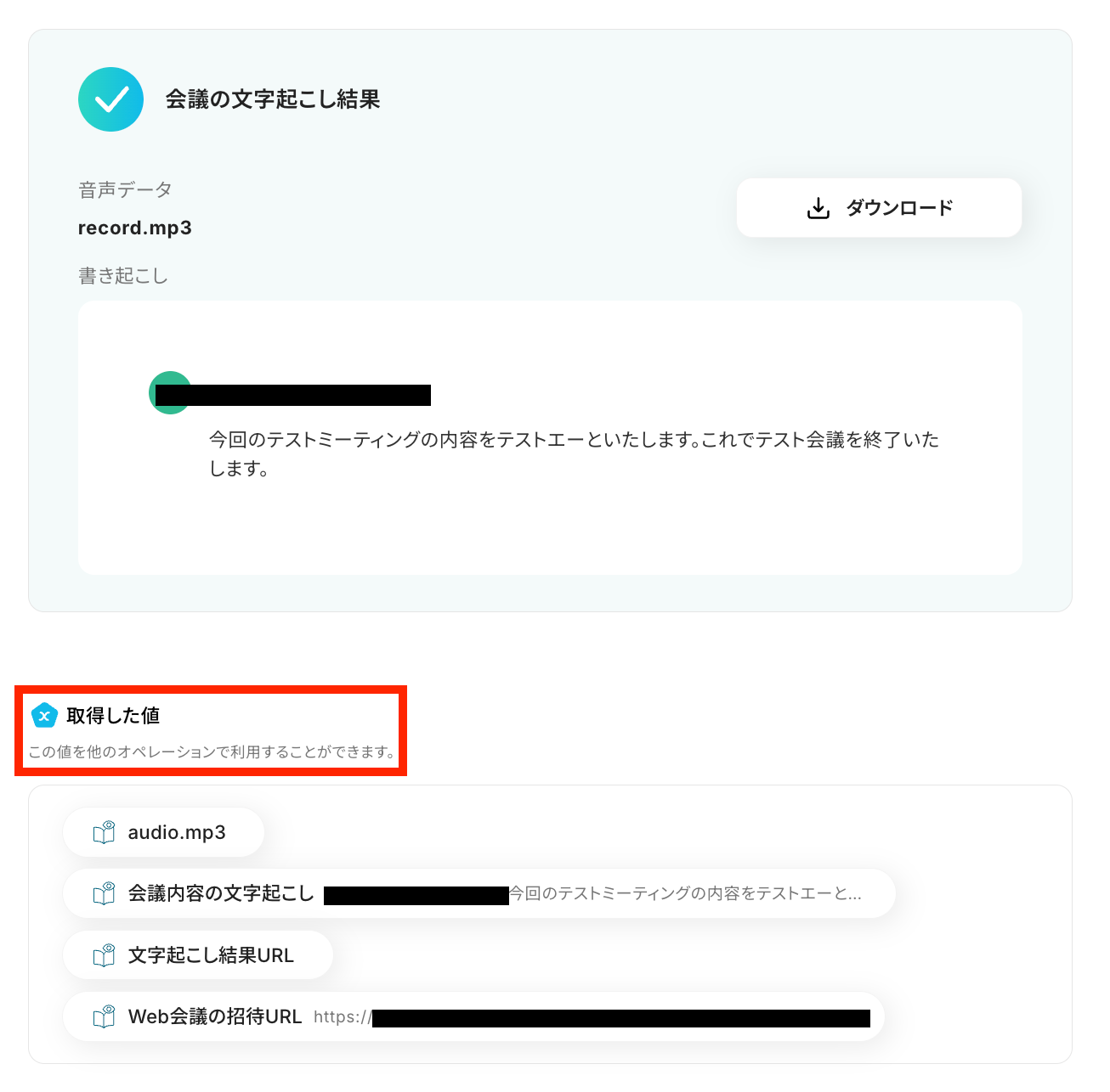 文字起こし結果と取得した値が確認できたら、「保存する」ボタンを押しておきましょう!
