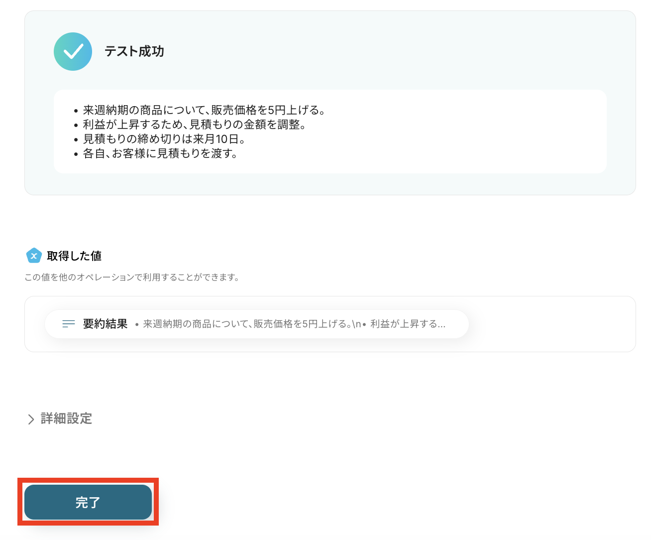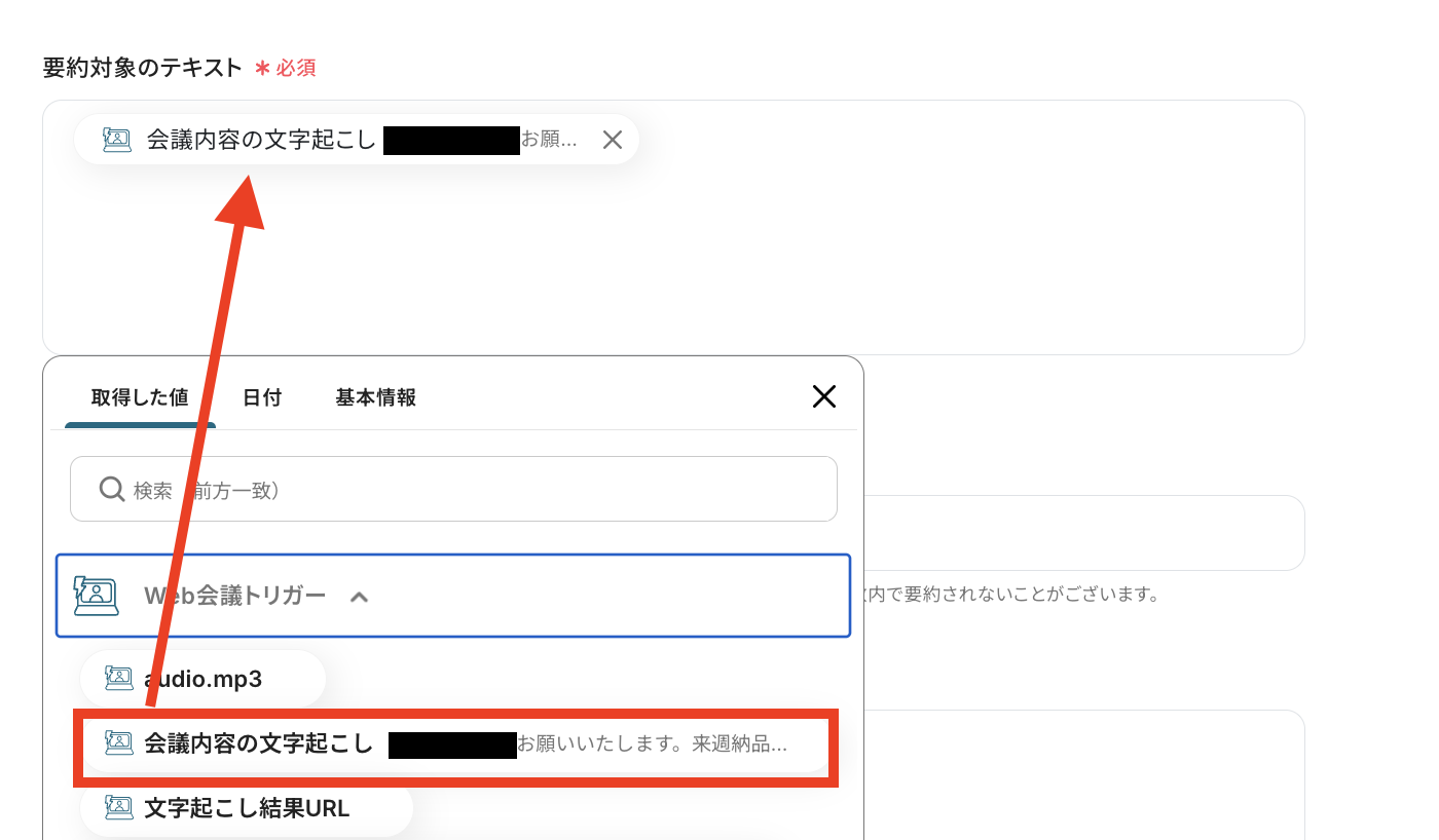 取得した値の中から、要約したい対象のテキストを選択します。 取得した値を利用することで、トリガーが起動するたびに最新の値を自動で引用できます。
