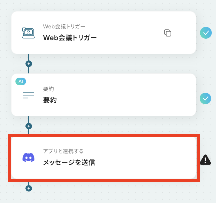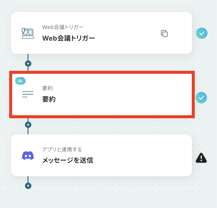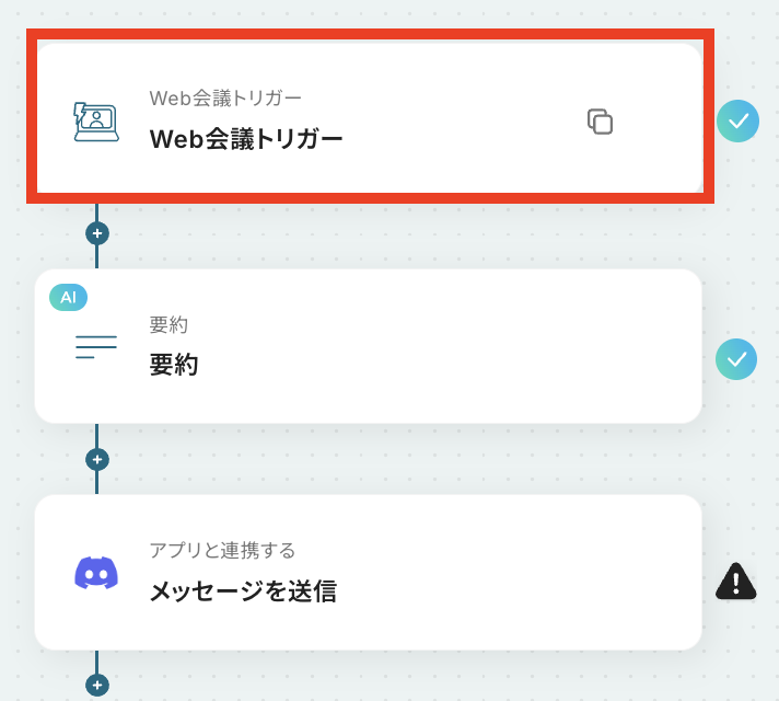 はじめに、DiscordをYoomと連携します。 次に、トリガーでWeb会議トリガーを選択し、「会議が終了したら文字起こしを開始する」アクションを設定します。 続いて、オペレーションでAI機能の「要約」を選択し、文字起こしされたテキスト内容を要約します。 最後に、オペレーションでDiscordの「メッセージを送信」アクションを設定し、要約結果を指定のチャンネルに送信します。 ※「トリガー」:フロー起動のきっかけとなるアクション、「オペレーション」:トリガー起動後、フロー内で処理を行うアクション■このワークフローのカスタムポイント