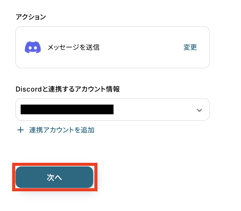 ステップ5:Discordのアクション設定 これまでに取得した値を使用して、Discordにメッセージを送信する設定を行います。 最後の赤枠をクリックしましょう!