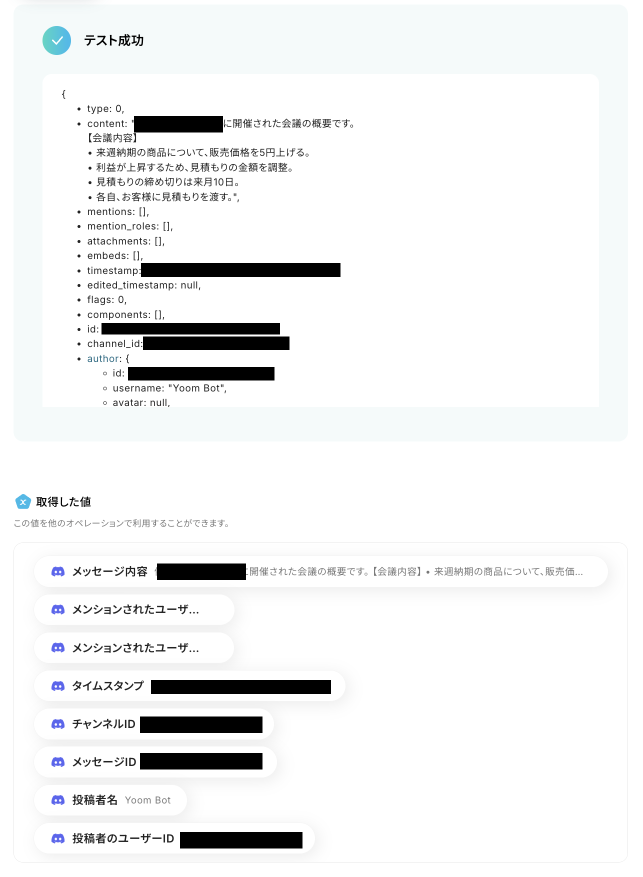 Discordへの通知設定では、メッセージを送信したいチャンネルを任意で設定できます。 送信するメッセージの本文は、固定のテキストだけでなく、文字起こし結果やAIによる要約など、前のステップで取得した情報を組み込んで自由にカスタマイズすることが可能です。 ■注意事項