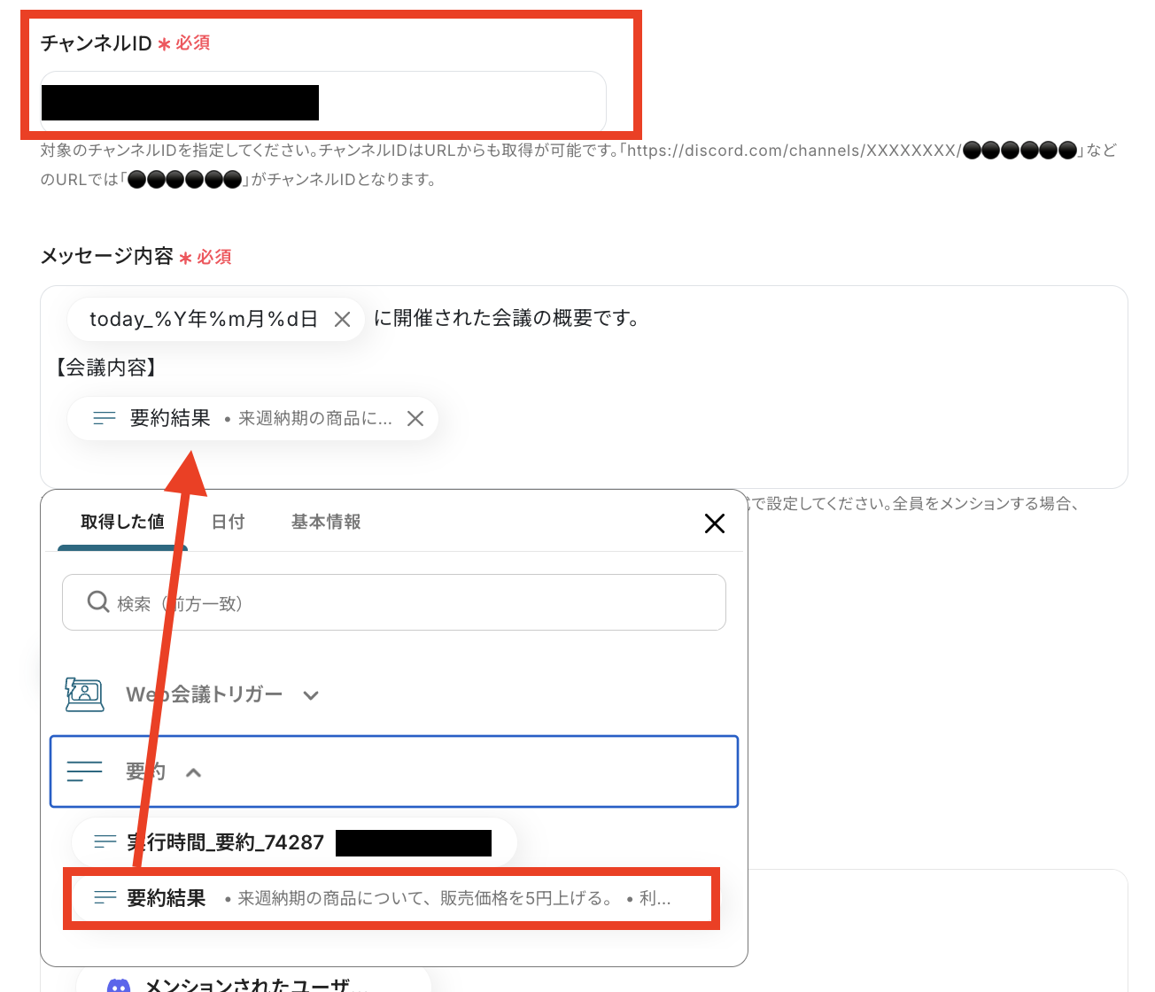 メッセージを送信する場所を設定するために、チャンネルIDを設定します。 続けて、メッセージの内容を取得した値を利用しながら作成していきましょう! これにより、Web会議ごとに変わる情報をDiscordへ動的に反映できます。