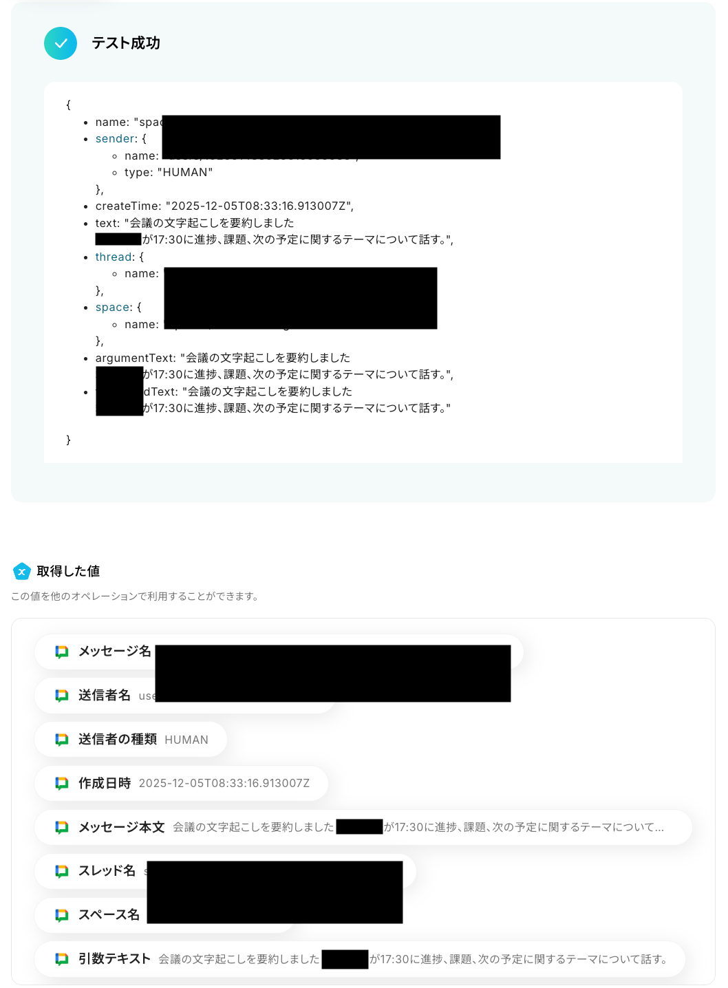 なお、テキストを直接入力した部分は固定値とされるため、取得した値を活用せず設定を行うと毎回同じメッセージがGoogle Chatで通知されてしまうので注意が必要です。