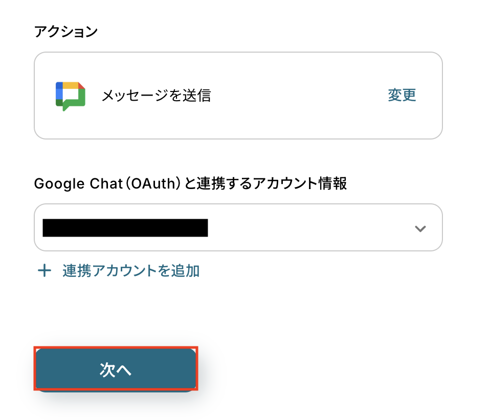 アクションはあらかじめ設定されているため、そのまま内容を確認してください。 Google Chatと連携するアカウント情報に問題がなければ、「次へ」をクリックします。