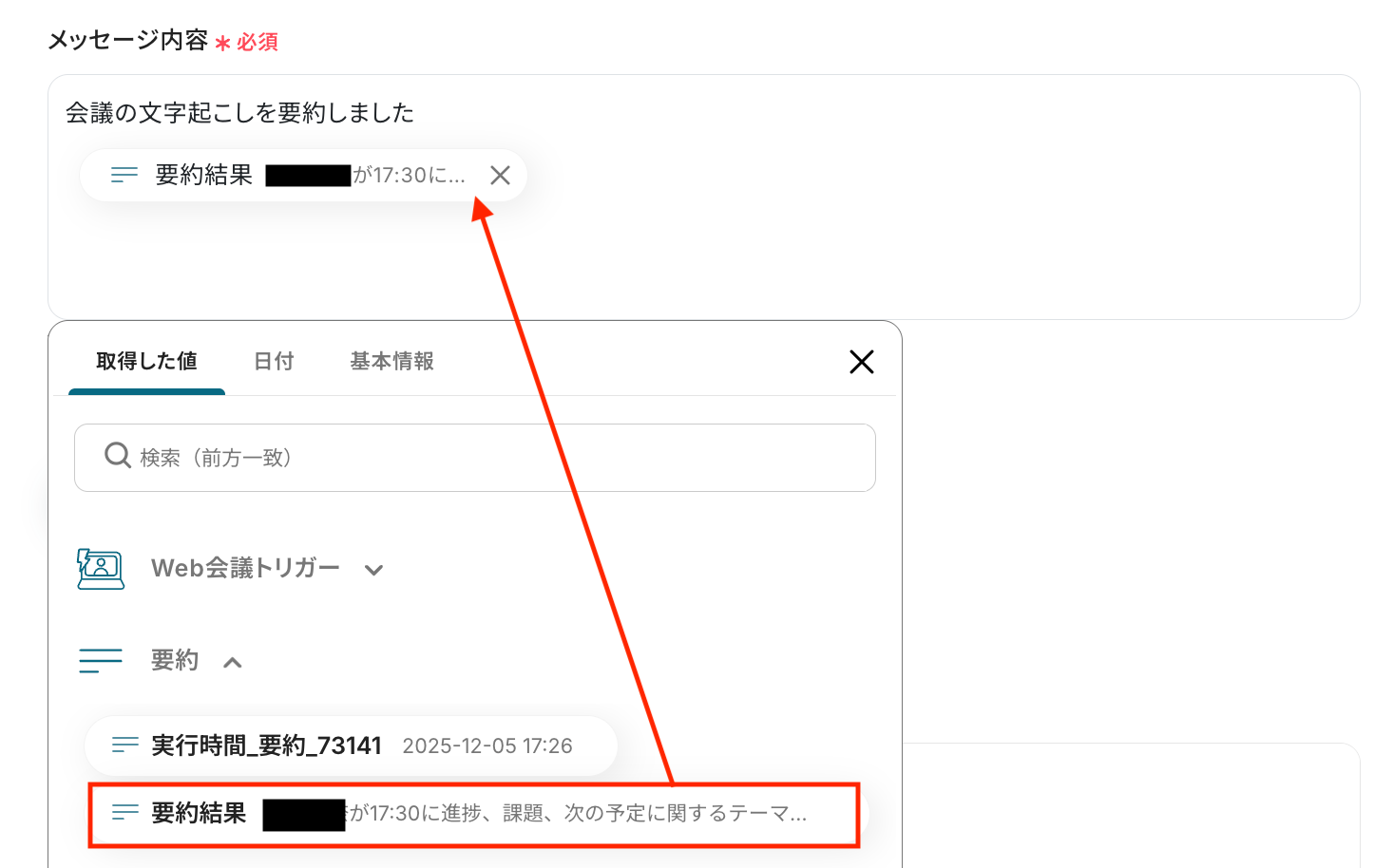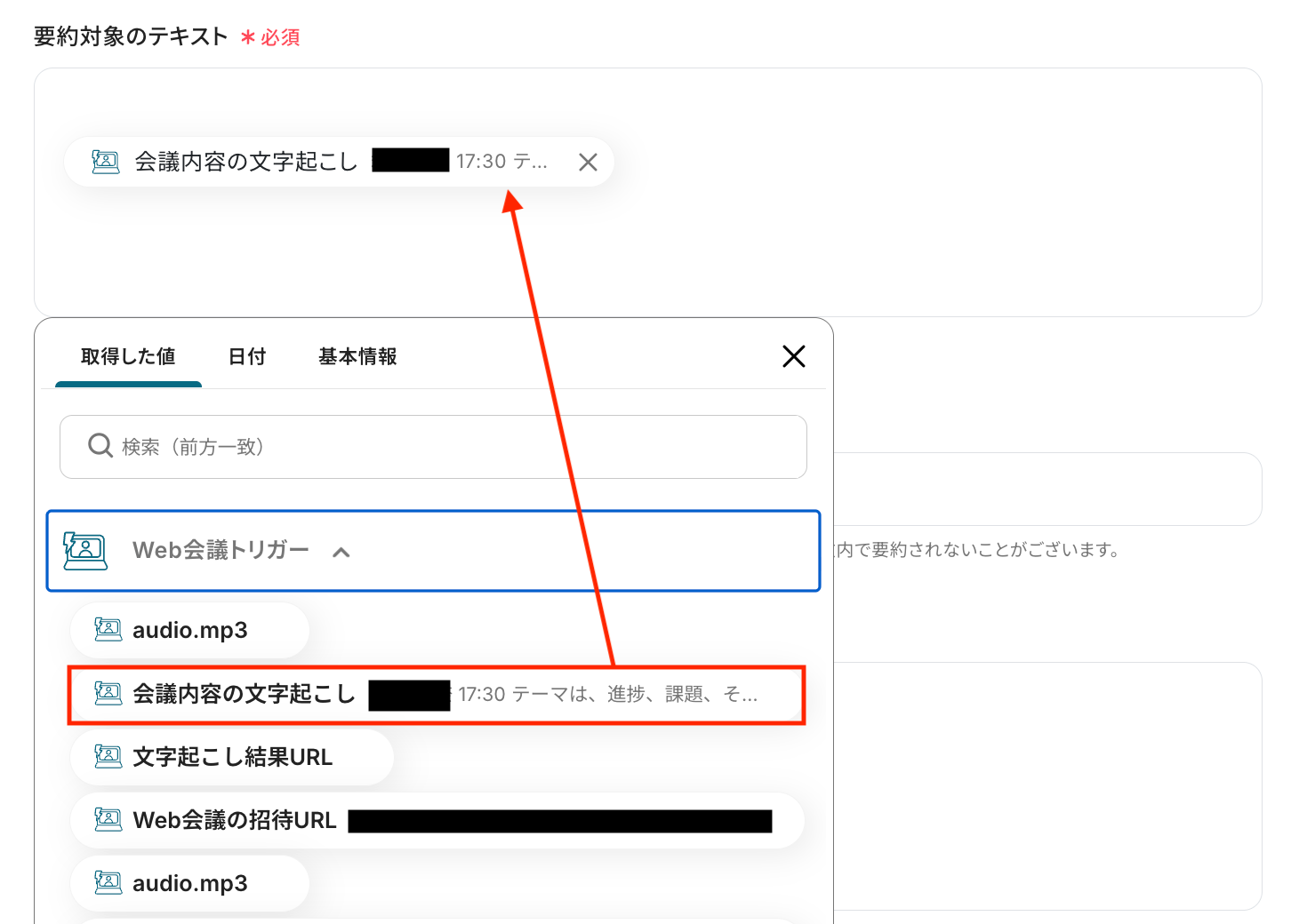 入力欄をクリックすると、Web会議トリガーで取得した値が表示されるので、そこから「会議内容の文字起こし」を選択してください。