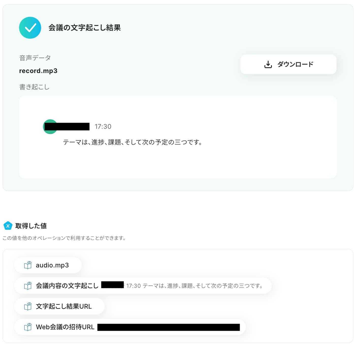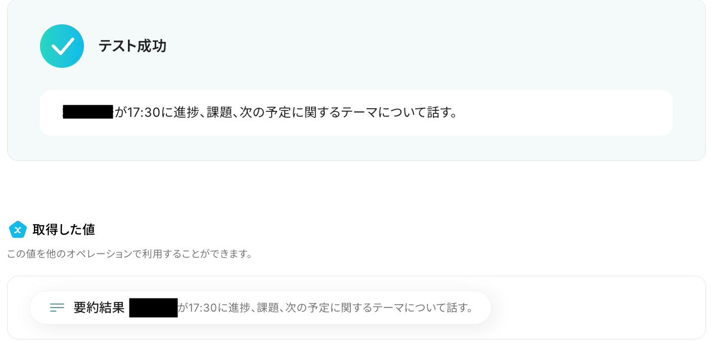 テストに成功すると、Web会議で文字起こしされた情報が表示されます。 以下の画像の取得した値(会議内容の文字起こし)は、この後の要約ステップで活用することが可能です。 ※取得した値 とは? トリガーやオペレーション設定時に、「テスト」を実行して取得した値のことを指します。 後続のオペレーション設定時の値として利用でき、フローボットを起動するたびに変動した値となります。