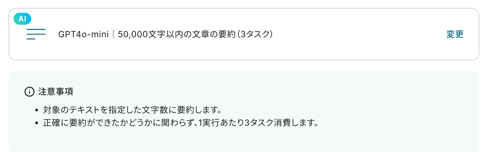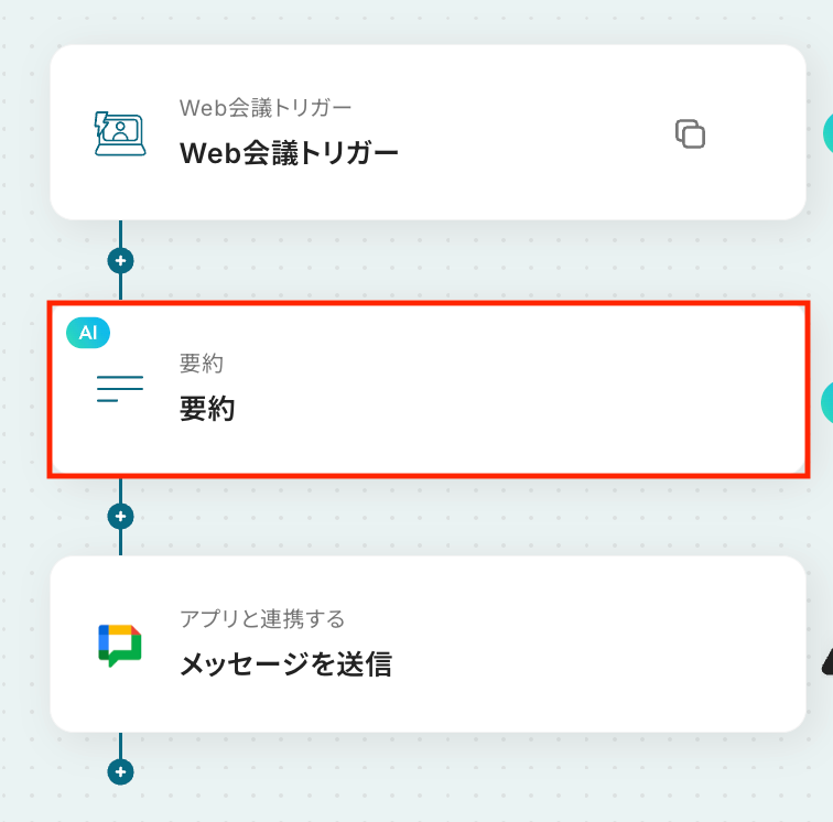 ステップ4:AI機能で要約の設定 続いて、Web会議トリガーで取得した値をもとに、AI機能でテキストを要約する設定を行いましょう。