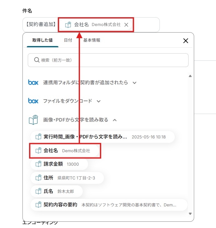 ここでは例として、「会社名,住所,氏名,請求金額,契約内容の要約(200字程度)」をダウンロードしたファイルから抽出しています。