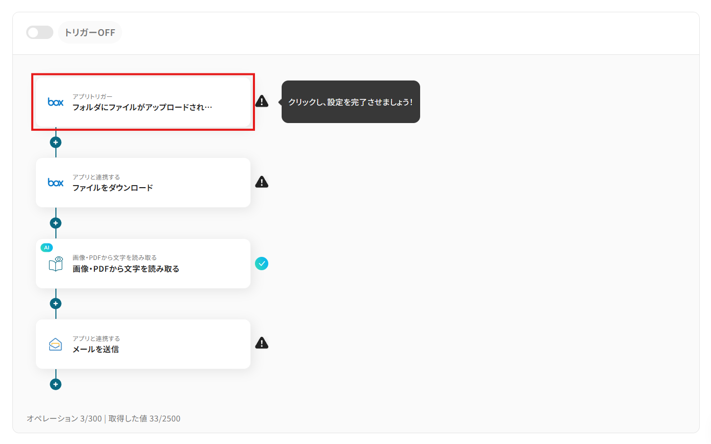 - トリガーとなるフォルダと各アクション(テキスト抽出・メール通知)の設定