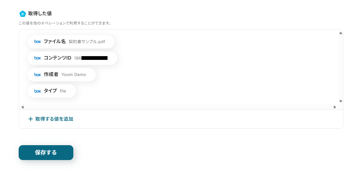 - テストに成功すると、設定した項目がファイルから抽出され、「取得した値」に追加されます。