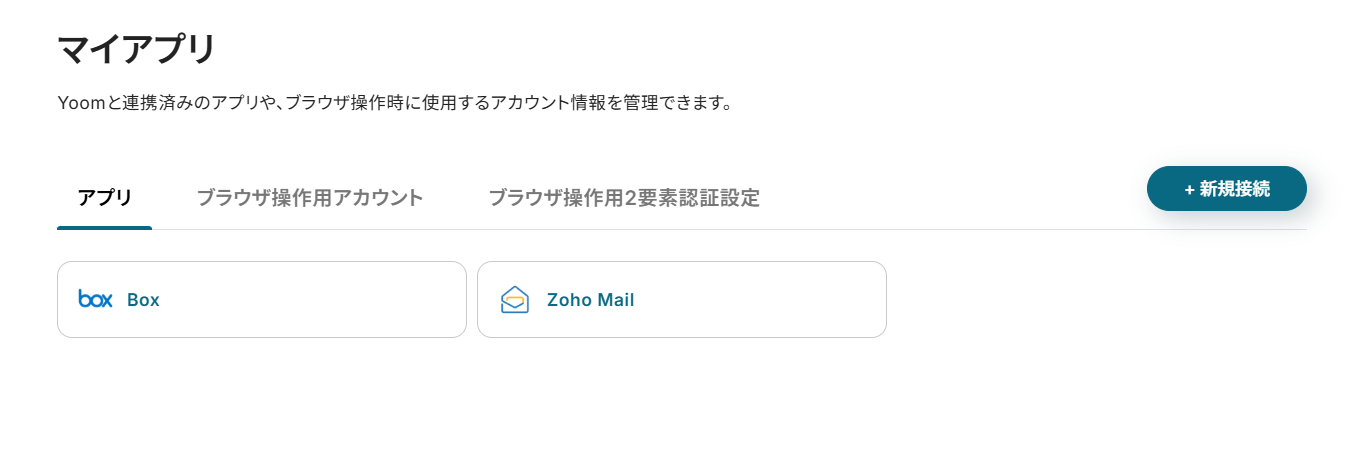 先ずは、Yoomと連携させたいZoho MailアカウントとBoxアカウントを「マイアプリ」に登録しましょう。