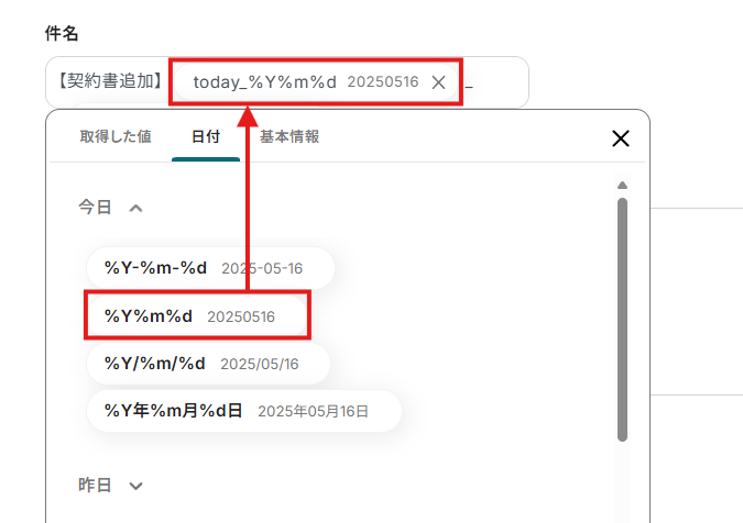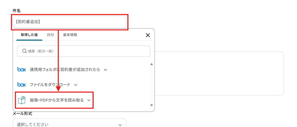 入力欄クリック時に表示される各アクションのメニューから、取得した値が選択可能です。