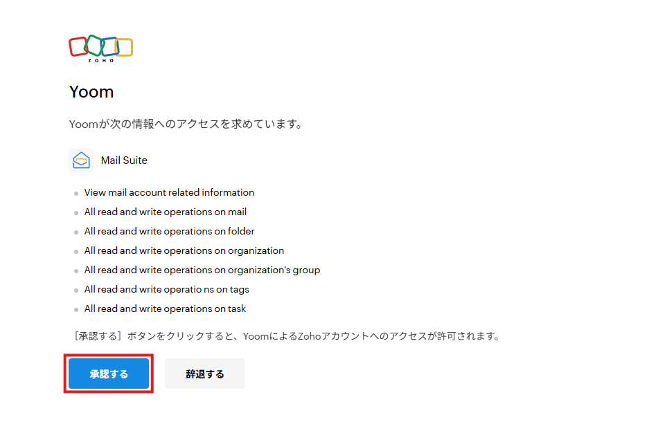 - YoomからZohoへのアクセス権限を確認し、「承認する」をクリック。