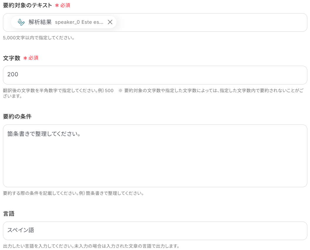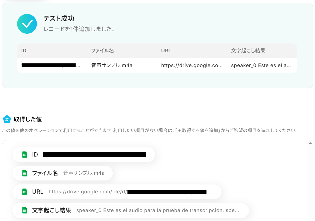 そこで取得した値をステップ6のレコードに加えると、文字起こしそのものだけでなく要約も追記することができます。