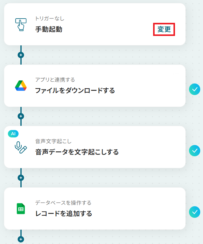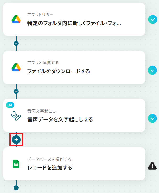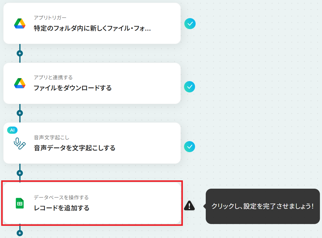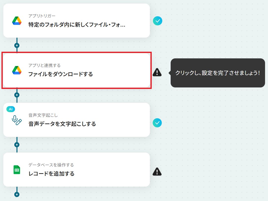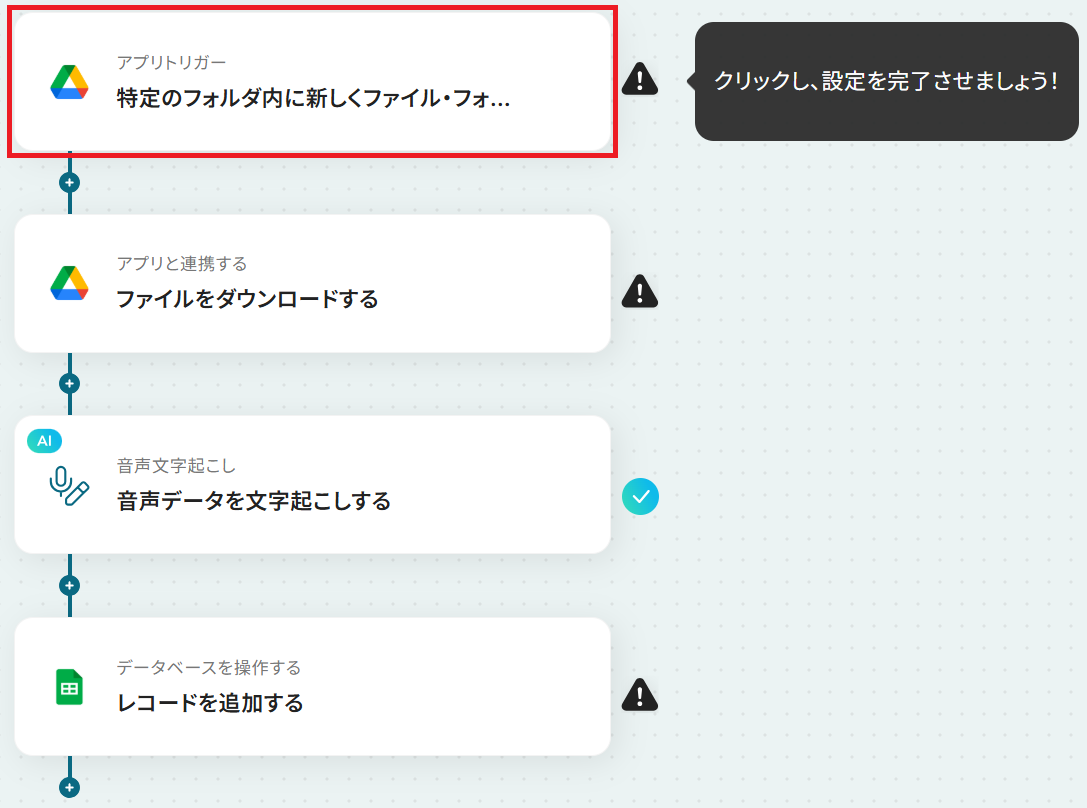 それではここから代表的な例として、Google Driveに音声データがアップロードされたら、文字起こしして、Google スプレッドシートに追加するフローを解説していきます!