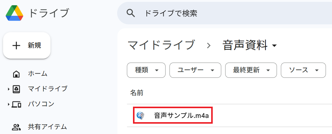 はじめに、Google Driveの特定フォルダにテスト用の音声ファイルを格納してください。