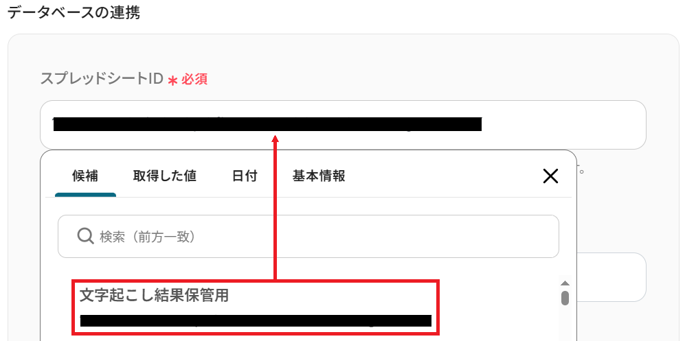 次に、先ほど用意したシートのスプレッドシートIDを候補から選択しましょう。