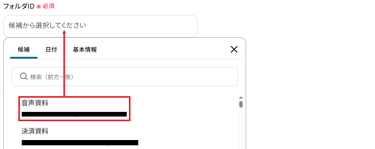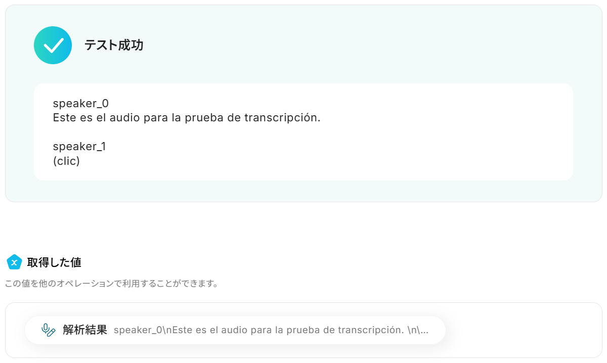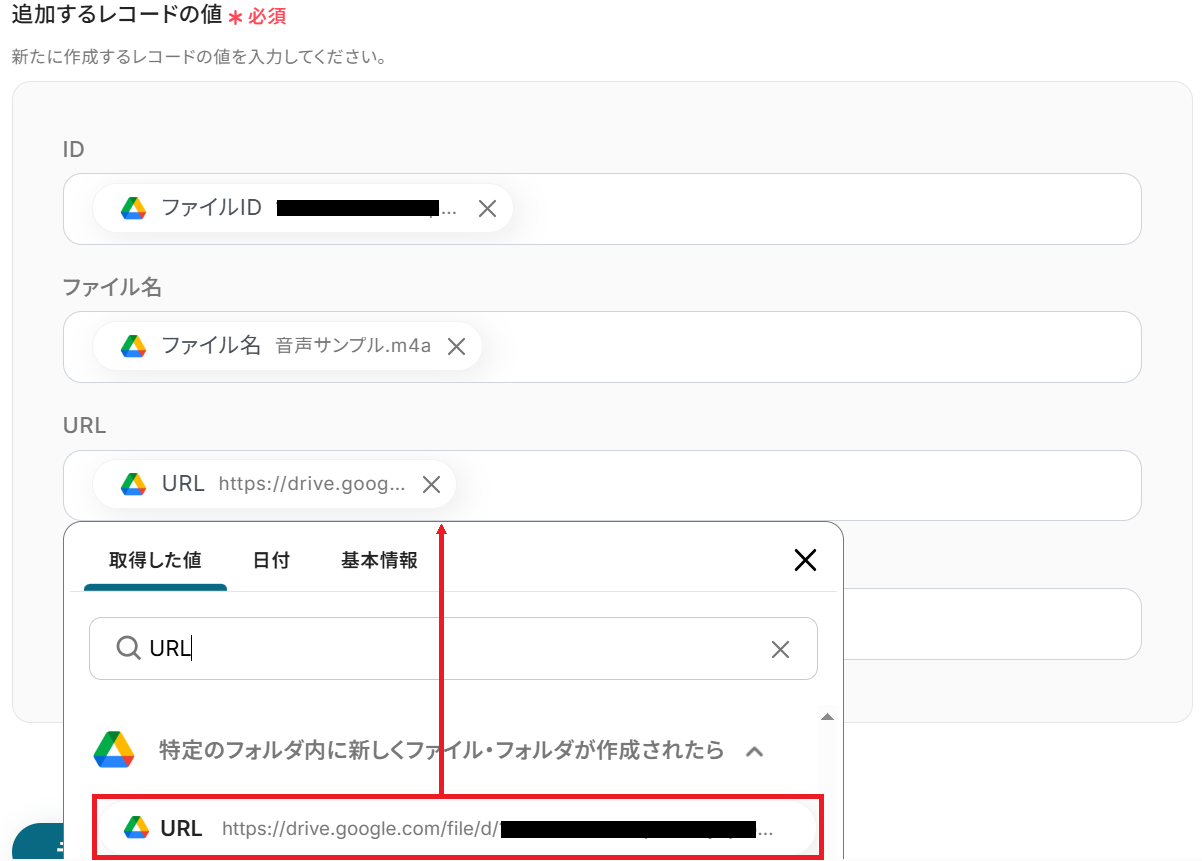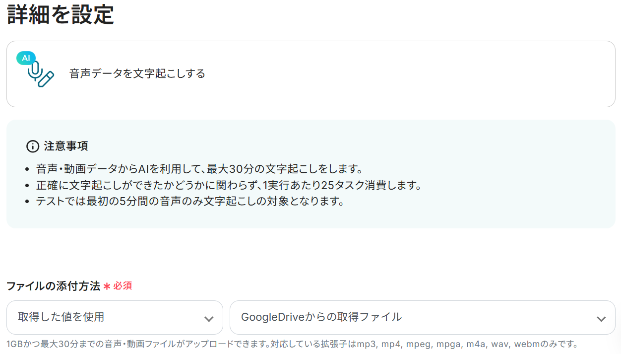 以下のようにGoogle Drive・文字起こし機能から取得した値を選択すると、ファイル情報や文字起こし結果を変数として反映させることができます。