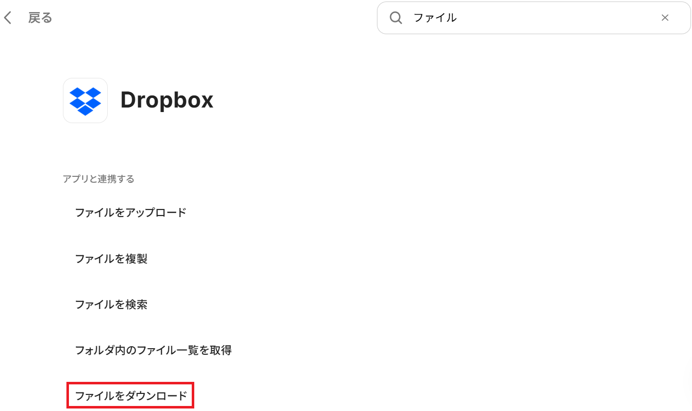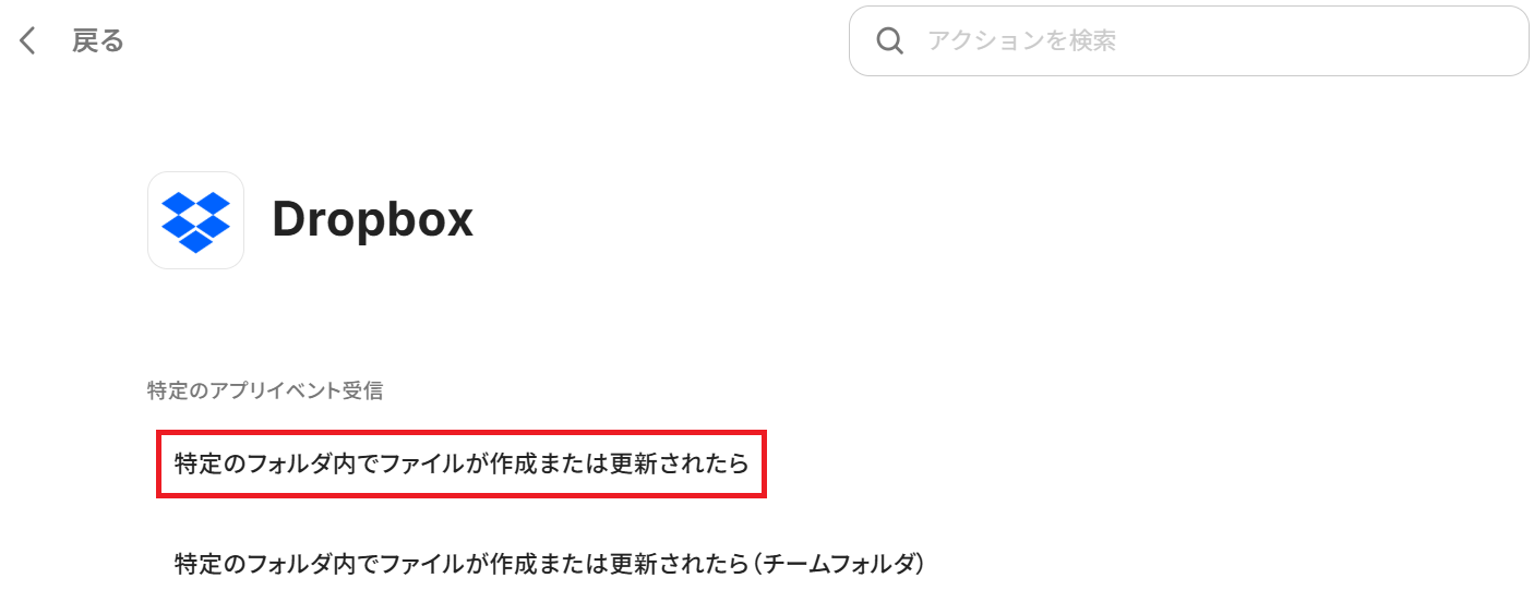 例えばDropboxと連携したい場合、Google Driveのトリガーとアクションを削除し、代わりにDropboxの「特定のフォルダ内でファイルが作成または更新されたら」のトリガーや「ファイルをダウンロード」のアクションなどを追加してください。