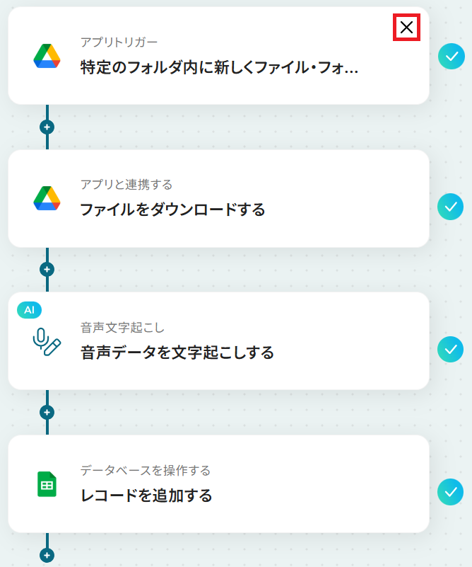 - Google Driveのトリガー設定とアクション設定、文字起こし設定、Google スプレッドシートのアクション設定