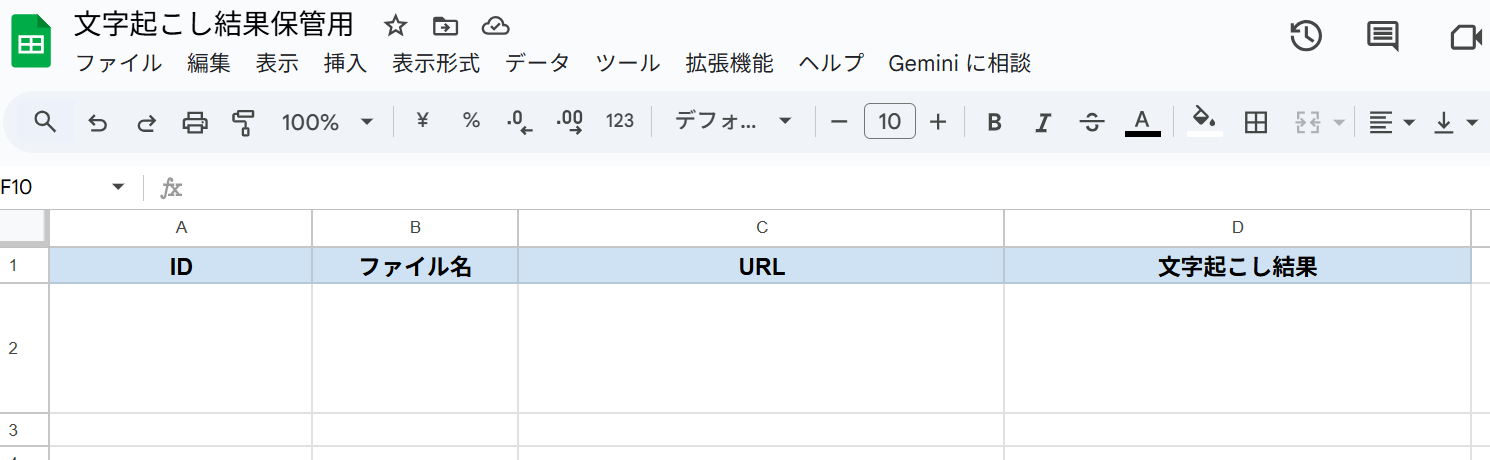 Google Driveのファイル情報および文字起こし結果が、用意したシートに自動で追記されました!