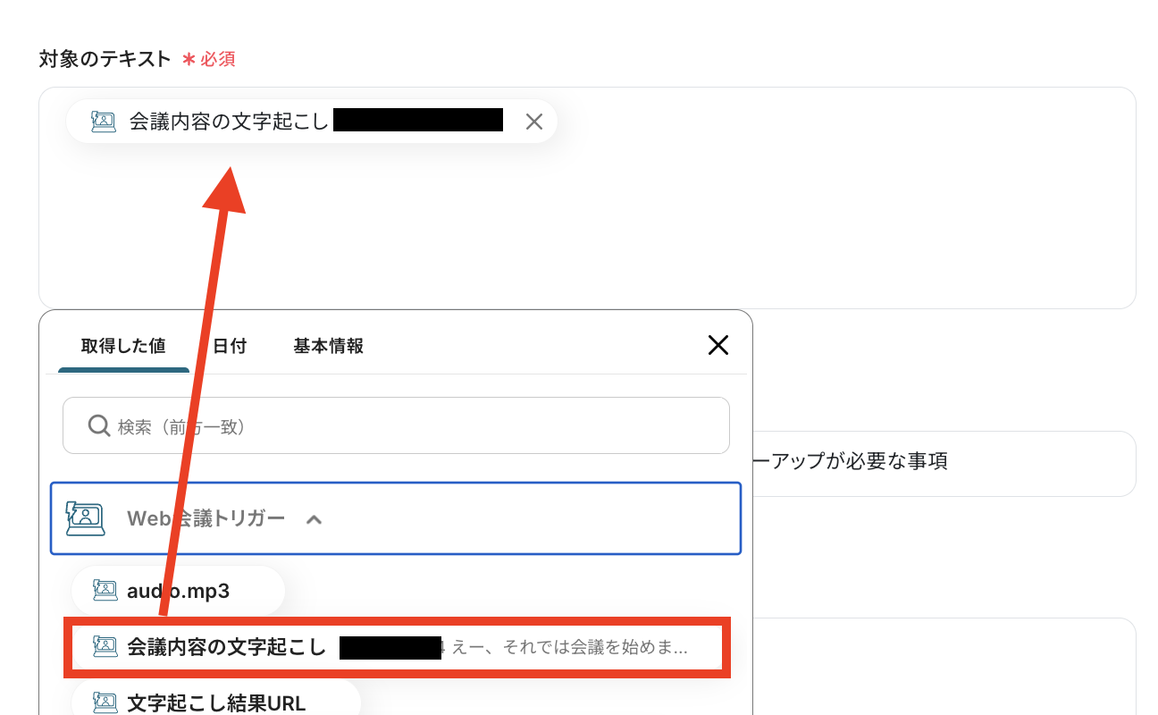 文字起こしのデータから特定のテキストを抽出する設定を行います。